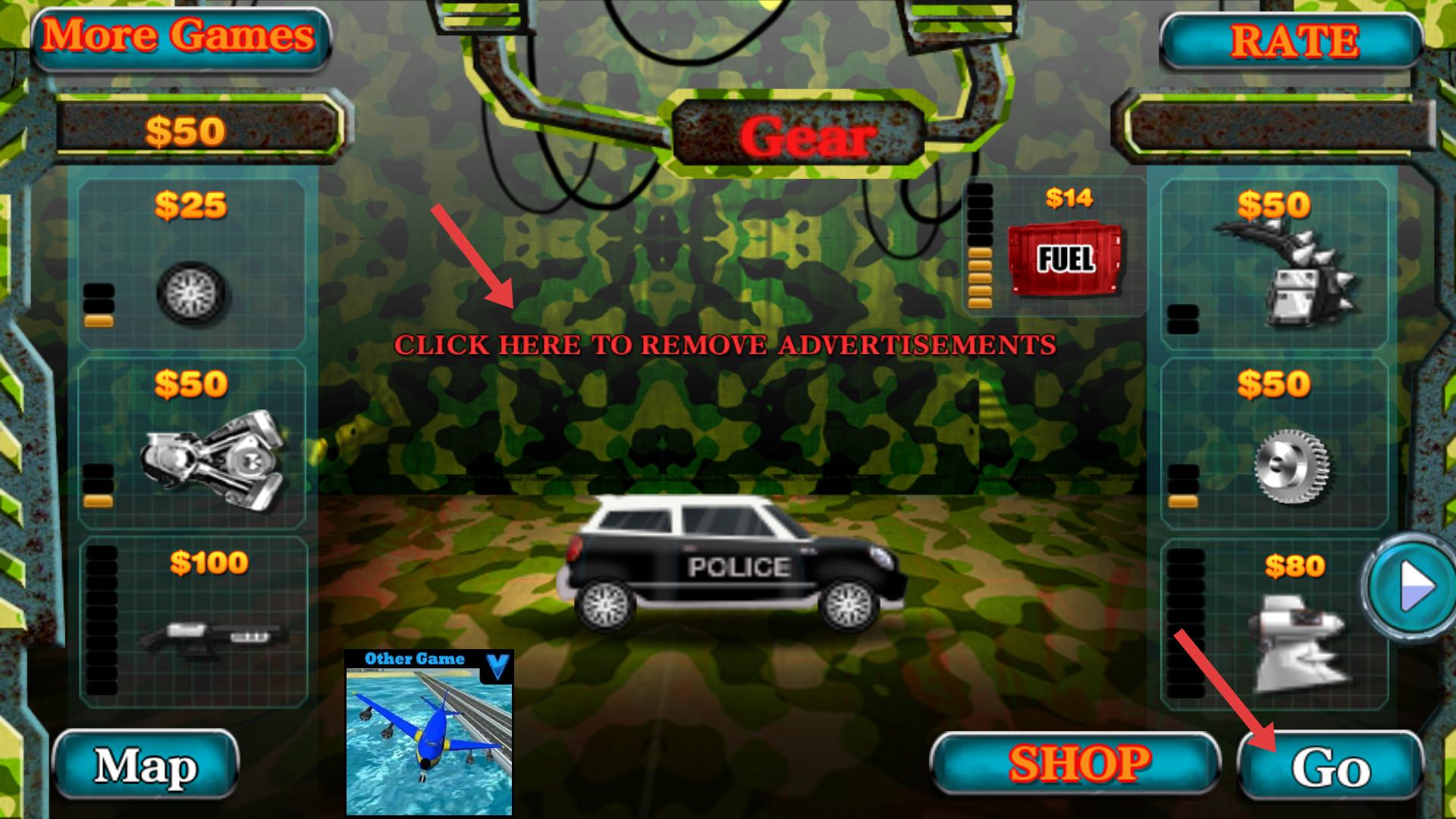 3、車庫界面可看到車輛及各類配件,有Go按鈕,點擊可開始游戲,也能點擊相關區域移除廣告,還可在商店用金錢購買輪胎、引擎等配件,強化警車。
