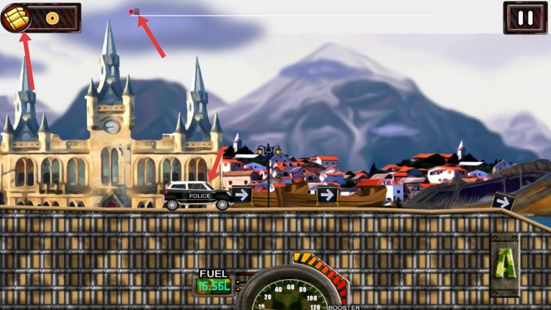 4、進入游戲場景駕駛警車前行,注意左上角的道具和上方的目標點,沿著道路行駛,避開障礙,朝著目標前進,同時關注燃油等狀態,順利完成任務。