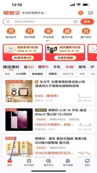 1、首頁,有搜索欄,展示雙11紅包活動,還有查歷史價、好價熱榜等功能入口及精選爆料商品,助力查找低價商品。