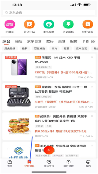2、好價爆料板塊,有閉眼買、百億補貼等功能入口,展示紅米K80手機、螺絲刀套裝等商品及價格、優惠信息,提供好價推薦。