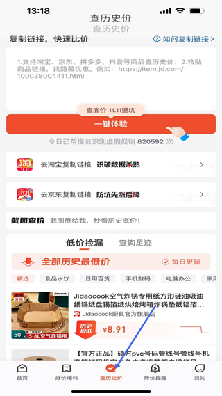3、查歷史價板塊,支持復制鏈接比價,可查多平臺商品歷史價,還有低價撿漏商品推薦,幫助識別虛假促銷。