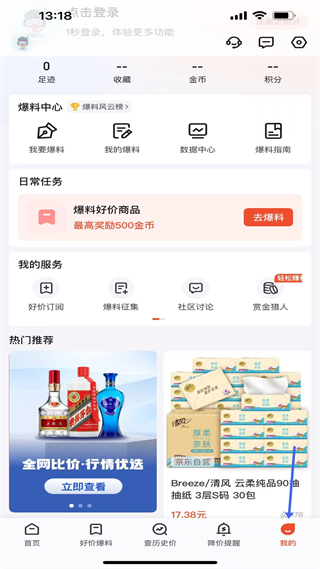 4、我的板塊,有登錄入口,可進行爆料、任務管理,還有好價訂閱、社區討論等服務,方便參與平臺互動。