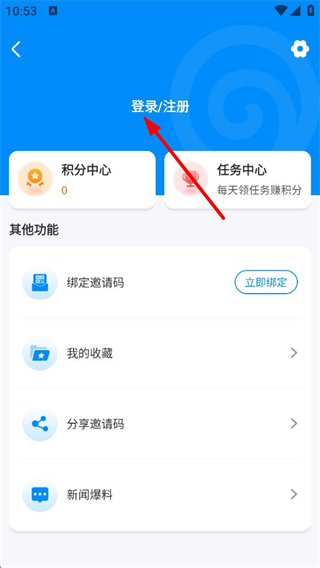 4、進入個人相關頁面,可看到登錄、注冊入口,還有積分中心、任務中心等功能板塊,可進行賬號登錄、查看積分和參與任務。