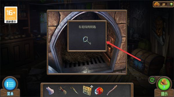 4、可找到有花紋的鑰匙道具,收集鑰匙后可用于打開鎖具等,繼續木屋里的解謎冒險。