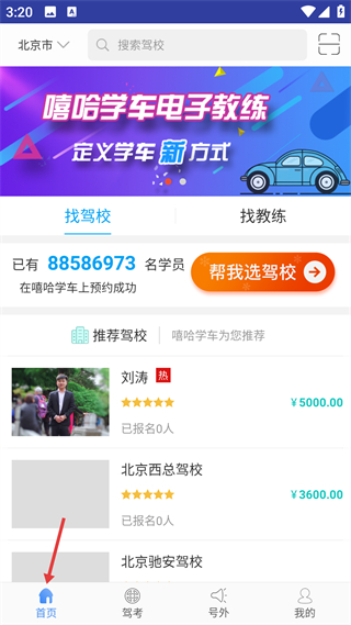 2、首頁,提供找駕校教練服務,展推薦駕校及價格,超8800萬學員預約成功,設選駕校輔助功能。