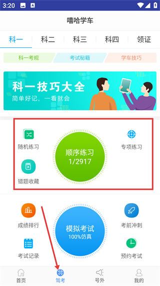 3、駕考頁,覆蓋科一至領證流程,提供練習及模擬考試工具,科一含2917題,模擬考試100仿真適配刷題。