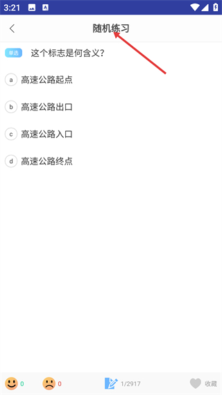 4、隨機練習頁,為科一單選題練習,圍繞交通標志出題,支持收藏,助力用戶鞏固知識點提升應試能力。