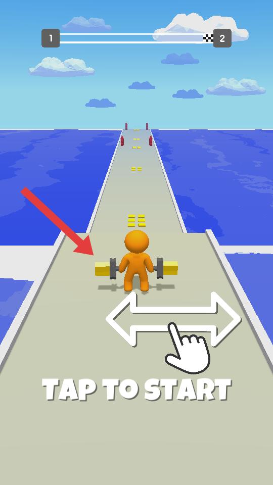1、游戲開始前,能看到橙色小人手持啞鈴站在跑道起點,界面有左右箭頭提示和TAP TO START字樣,點擊后即可開啟跑酷。