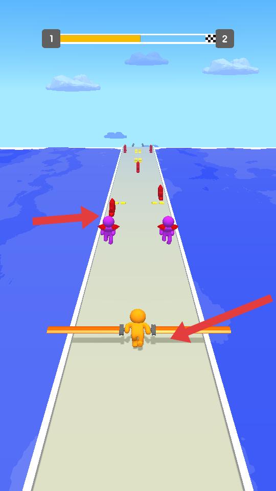 2、跑酷過程中,橙色小人會遇到紫色小人等阻礙,要操控小人左右移動,避開這些阻礙,同時手中啞鈴可能會變化,需靈活應對。
