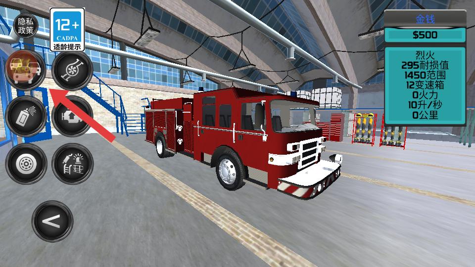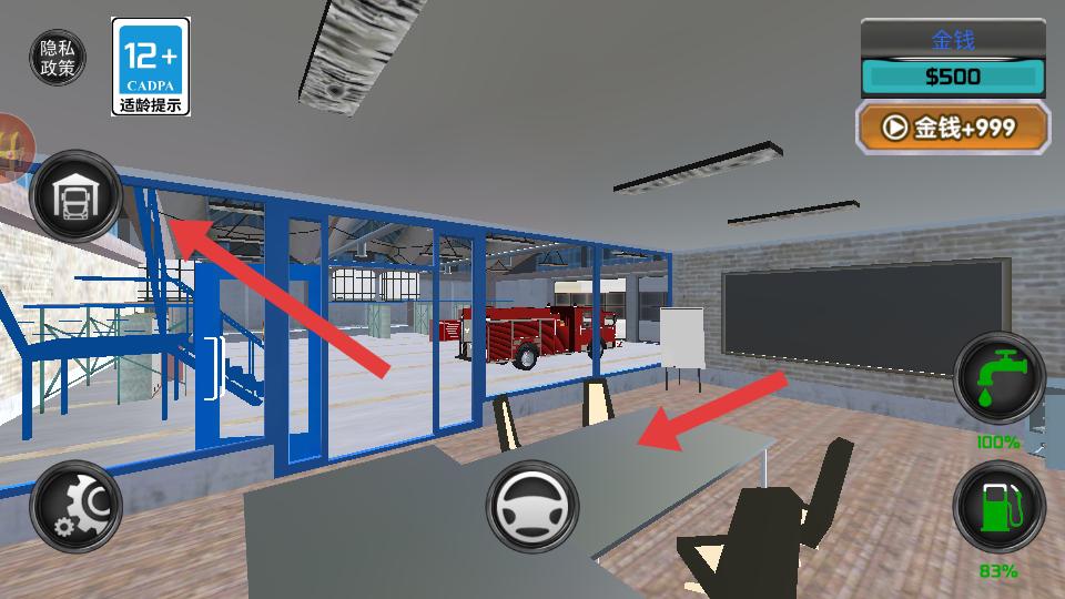 1、進入游戲,可看到金錢數量等信息,還有車庫等功能按鈕,能到室內場景中準備駕駛消防車執行任務。
