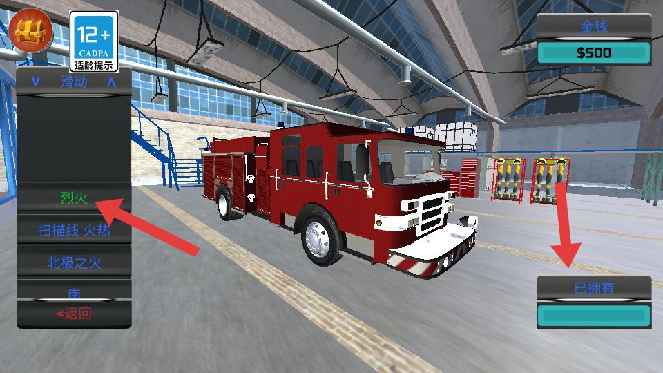 3、游戲里可選擇不同的消防車類型,比如烈火等,若已擁有,可直接使用,開啟消防任務。