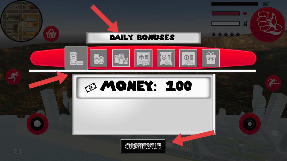 2、進入游戲后,可領取DAILY BONUSES,能獲得不同數量的金幣等獎勵,初始擁有100金錢,點擊CONTINUE繼續游戲。