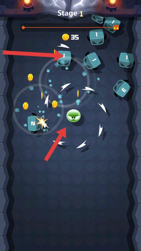 2、進入Stage1,操控帶有旋轉刀片的綠色小球,擊碎周圍帶數字的藍色方塊,過程中可收集金幣,積累分數。