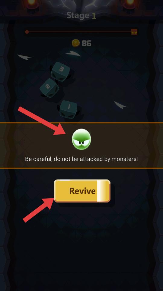 3、若綠色小球被怪物攻擊,會出現提示Be careful,do not be attacked by monsters,此時可點擊Revive按鈕復活繼續游戲。