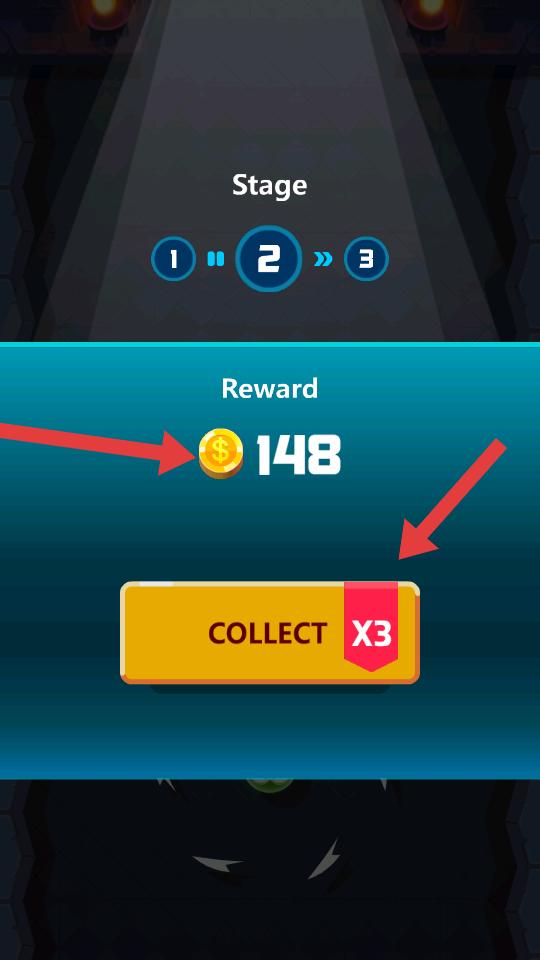 4、成功通過關卡后,會顯示Reward及獲得的金幣數量,點擊COLLECT按鈕可領取獎勵,還能觸發3倍獎勵,獲取更多金幣。