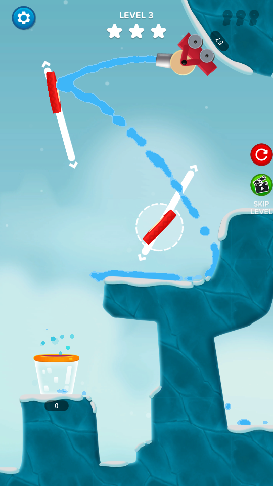 1、進入游戲關卡,需調整帶有紅色部分的白色桿件,引導水流從發射裝置流向下方容器,完成水流引導任務。