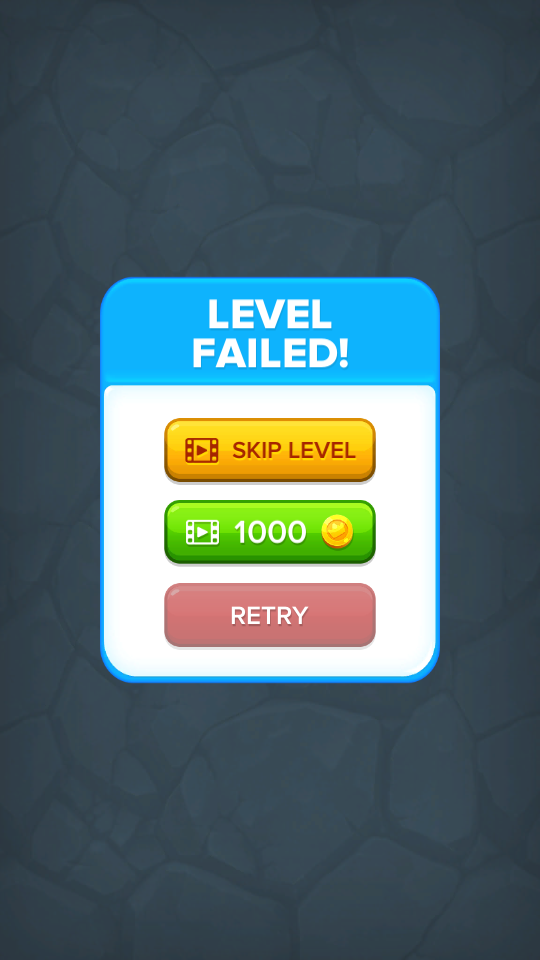 2、若關卡失敗,會彈出LEVEL FAILED提示框,可選擇SKIP LEVEL,RETRY等,重新挑戰或跳過該關卡。
