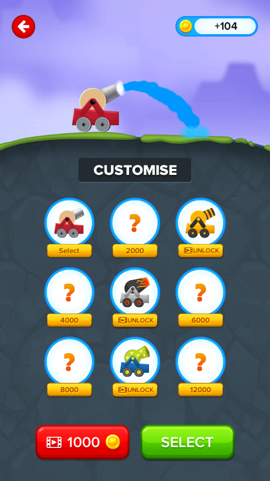 3、在定制界面,能看到多種不同的發射裝置,可用金幣解鎖,選好后點擊SELECT,使用該裝置進行游戲。