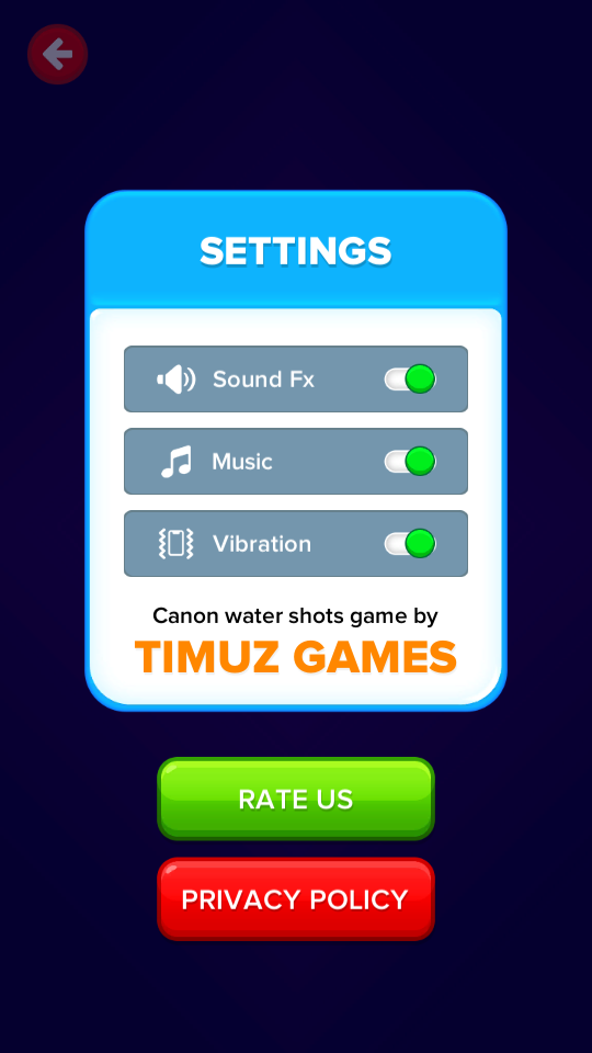 4、進入設置界面,可調節Sound Fx,Music,Vibration的開關狀態,還能點擊RATE US評價游戲或查看隱私政策。