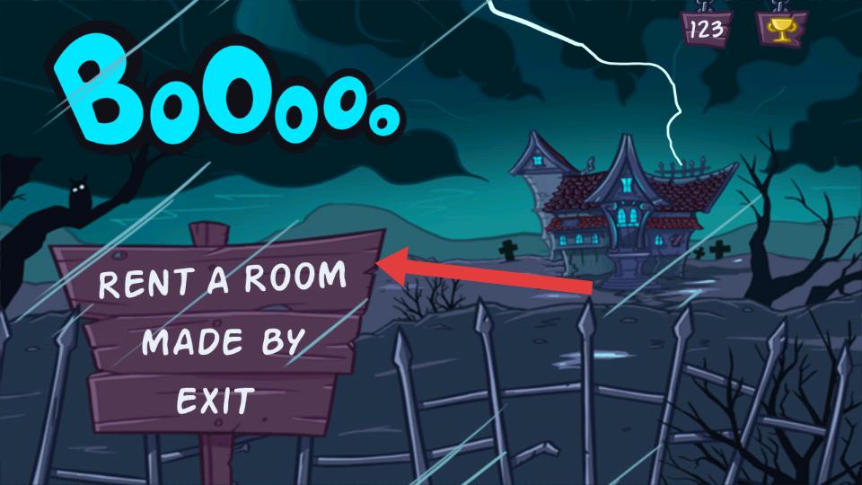 1、游戲開始會看到帶有RENT A ROOM,MADE BY,EXIT字樣的木牌,選擇RENT A ROOM,就能進入關卡選擇界面,開啟游戲。
