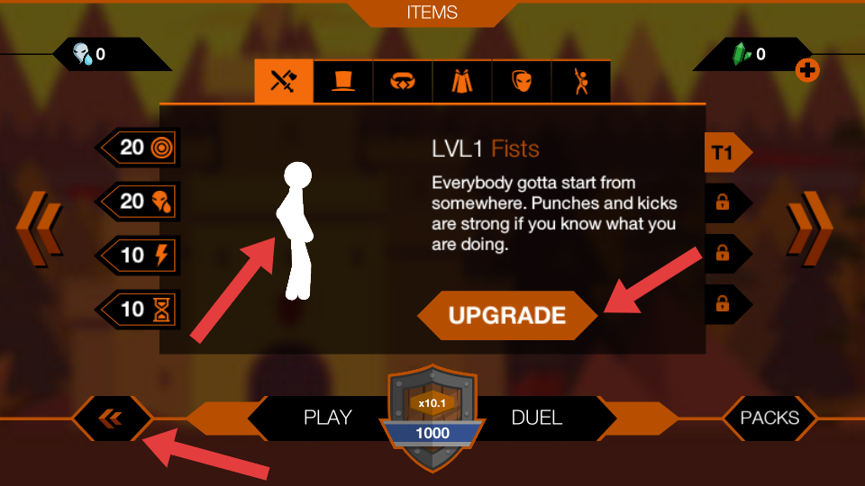 3、點擊ITEMS進入物品界面,能查看火柴人的初始裝備,還可通過消耗相應資源點擊UPGRADE對裝備進行升級,提升火柴人戰斗能力。
