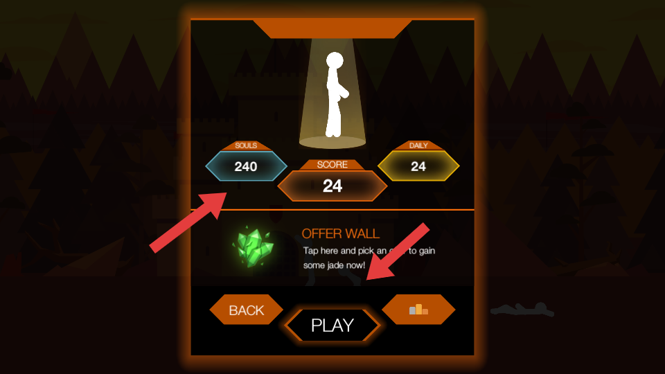 4、游戲過程中,能看到獲得的分數,靈魂數量等信息,結束游戲后點擊PLAY可以重新開始戰斗,還能點擊OFFER WALL獲取額外綠寶石獎勵。