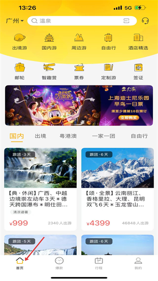 1、首頁定位廣州有搜索欄和多旅游功能入口,展示上海迪士尼廣告及廣西崇左、云南麗江等國內跟團游產品,底部有功能欄。