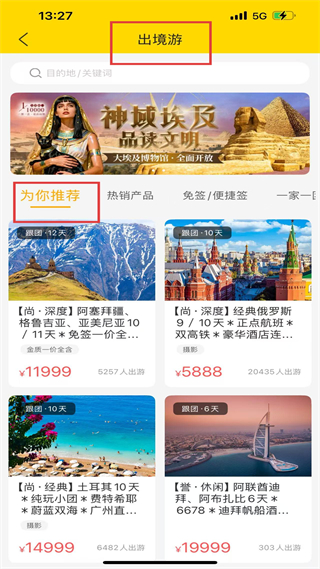 2、出境游板塊有埃及旅游廣告,為你推薦阿塞拜疆、俄羅斯等出境跟團游產品,覆蓋多國旅游線路。