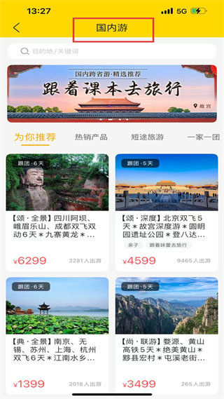 3、國內游板塊有跟著課本去旅行廣告,為你推薦四川阿壩、北京等國內跟團游產品,涉及多個熱門旅游地。