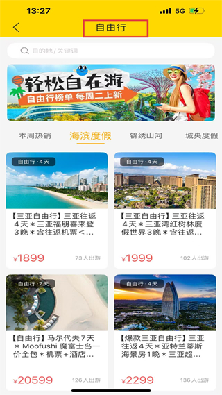 4、自由行板塊有輕松自在游廣告,海濱度假欄呈現三亞、馬爾代夫等自由行產品,滿足自由行游客需求。