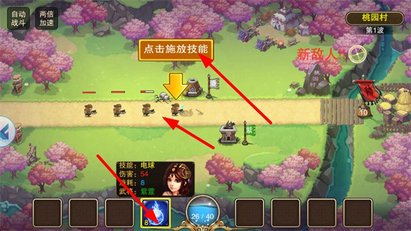 1、點擊釋放技能如電球,攻擊敵人,阻擋敵人前進,通過技能和塔防布局擊敗敵人,保衛陣地。