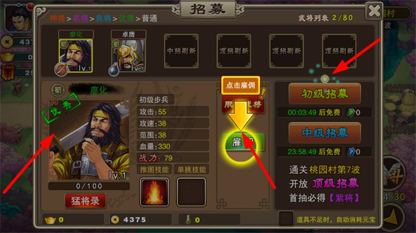 3、在招募界面進行初級招募,獲得武將如廖化,增強塔防戰力,讓武將加入戰斗,提升防御能力。