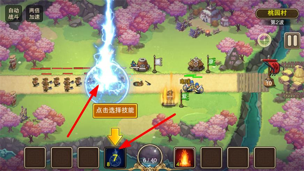 4、選擇不同技能如雷電技能,攻擊敵人,造成大量傷害,快速擊敗敵人,完成塔防關卡挑戰,獲取獎勵。