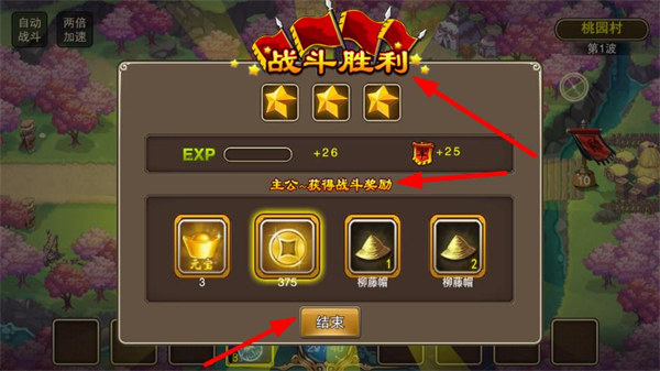 2、戰斗勝利后獲得經驗、金幣等獎勵,點擊結束戰斗,提升角色等級,解鎖新技能和游戲內容。