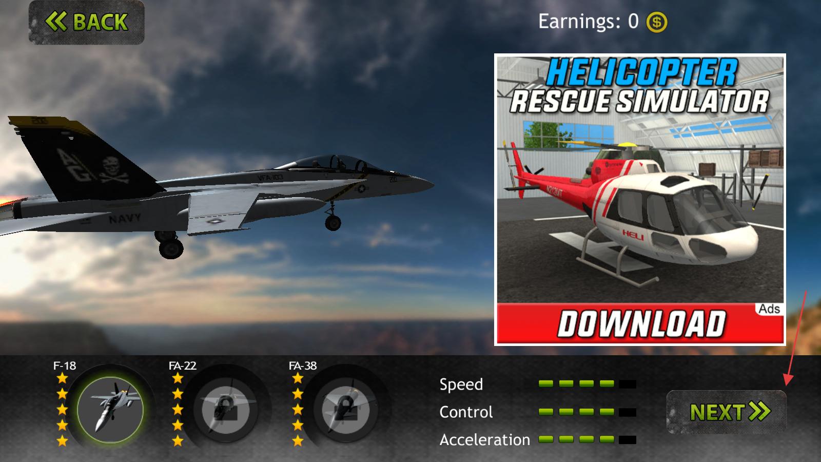 2、來到戰機選擇界面,能看到不同型號戰機及相關性能參數,選好戰機后點擊界面右下角綠色的NEXT按鈕,以此進入飛行前的駕駛艙準備場景。
