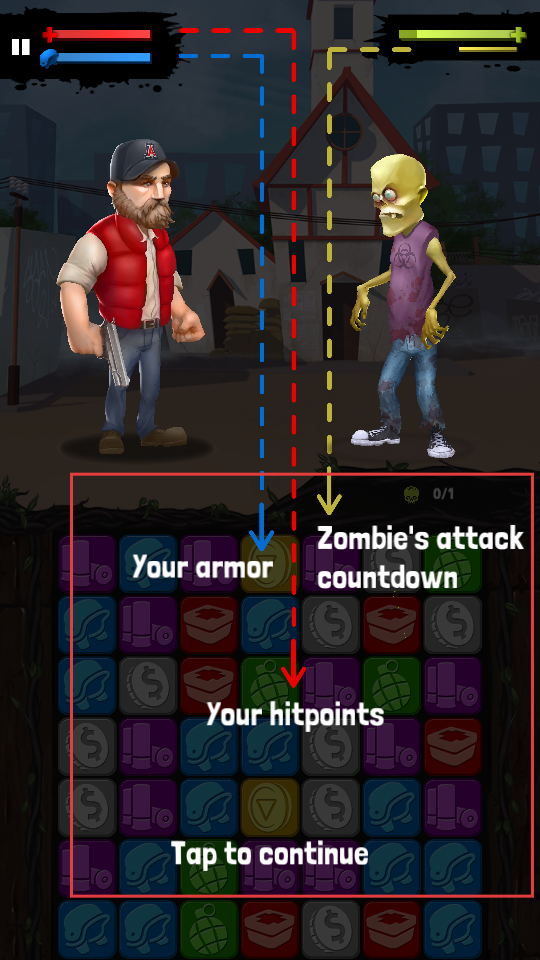 2、游戲中有耐久度和生命值等標識,還有Zombies attack countdown提示,點擊屏幕繼續,了解自身和僵尸的狀態,為對戰做準備。