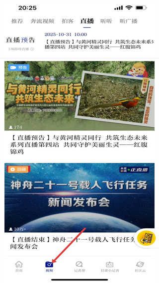 2、視頻板塊,有推薦、直播等分類,展示紅腹錦雞生態直播預告、神舟二十一新聞發布會回放等內容,支持查看多元視頻。