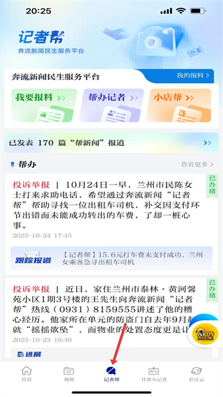 3、記者幫板塊,是民生服務平臺,設我要報料、幫辦記者等功能,展示蘭州打車費、防盜門問題等幫辦案例,提供民生服務。