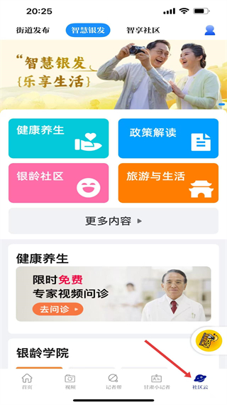 4、社區云板塊,有智慧銀發、智享社區等分類,設健康養生、政策解讀等功能入口,展示專家視頻問診等內容,服務社區居民。