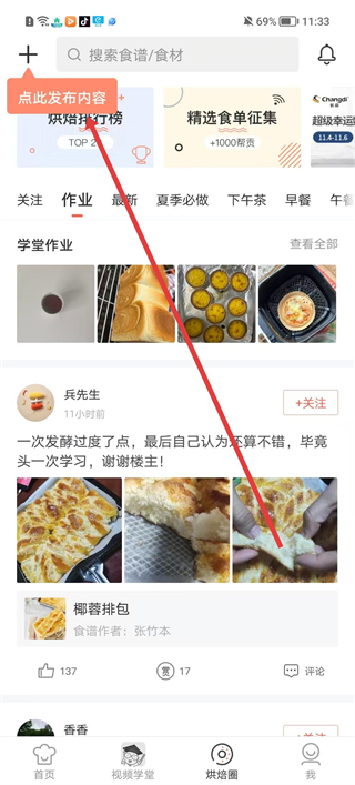 3、在烘焙圈頁面可點擊發布內容,查看學堂作業和網友分享的烘焙作品,還能對作品進行點贊。