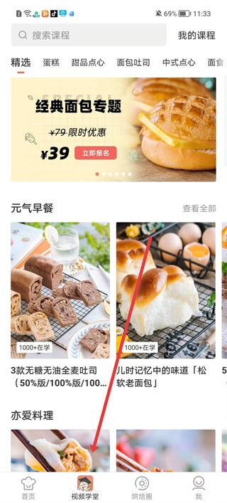 1、進入烘焙幫APP,可查看精選課程,如經典面包專題,還有元氣早餐、亦愛料理等分類,點擊視頻學堂可進入相關頁面。