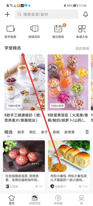 4、在首頁可查看學堂精選課程,如新手指南、烘焙百科等,選擇感興趣的課程進行學習,還能查看我的課程。