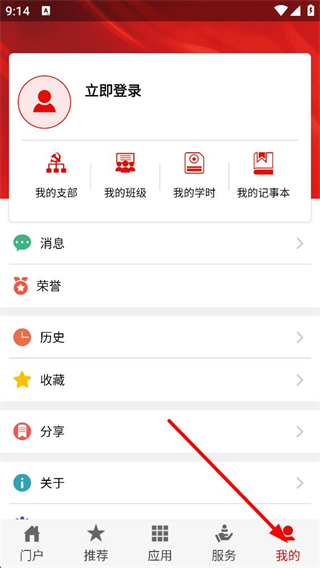 2、點擊底部我的按鈕,進入個人中心界面,可看到立即登錄入口,下方還有我的支部、我的班級等功能選項,點擊登錄可進入登錄界面。