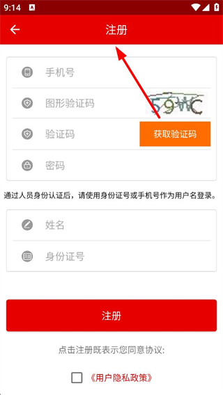 4、若沒有賬號可點擊注冊,注冊界面輸入手機號、圖形驗證碼、獲取的驗證碼、密碼,以及姓名和身份證號,勾選用戶隱私政策后點擊注冊即可。