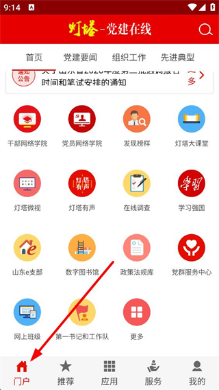 1、進入燈塔黨建在線應用后,門戶頁面可看到干部網絡學院、黨員網絡學院等多個功能入口,包括黨建學習、資訊、服務等多方面內容。