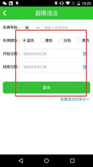 3、超限違法查詢界面,填車牌、顏色、日期,點查詢查違法記錄。