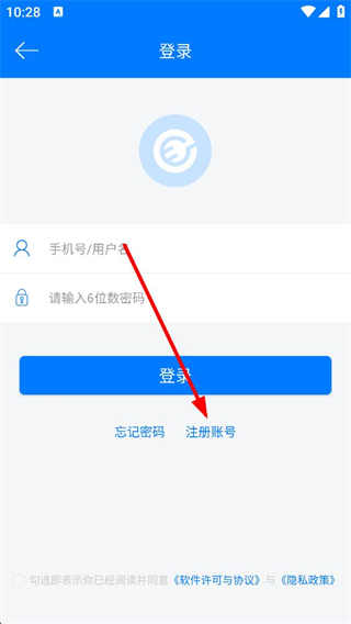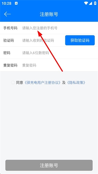 3、點擊注冊賬號進入對應界面,需填寫注冊手機號獲取驗證碼,設置并重復輸入6位數密碼,勾選協議后可完成注冊。