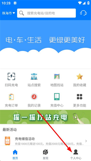 1、進入電車充電服務首頁,可見掃碼充電站點搜索等功能選項,點擊底部個人中心,進入登錄相關的操作頁面。