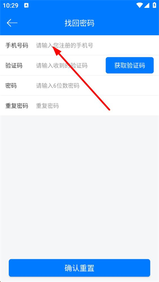 4、點擊忘記密碼進入找回密碼界面,填寫注冊手機號獲取驗證碼,設置新密碼后點擊確認重置,完成密碼找回操作。
