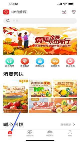 2、首頁,有活動banner、多個功能入口,展示消費幫扶和暖心回饋板塊,涵蓋助農商品、食堂集采、新品嘗鮮等內容。
